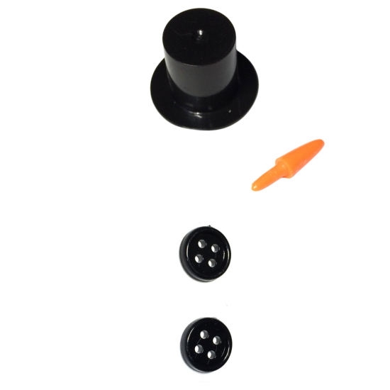 ミニチュア スノーマン 小物セット 小は、かわいいアクセサリーが詰まったセットです。帽子(直径約20mm)、プラスチックノーズ(長さ約11mm、根本部分直径約5mm)、ボタン直径約10mm 2個が入っています。これらを使って、リアルなスノーマンを手作りできるんです。